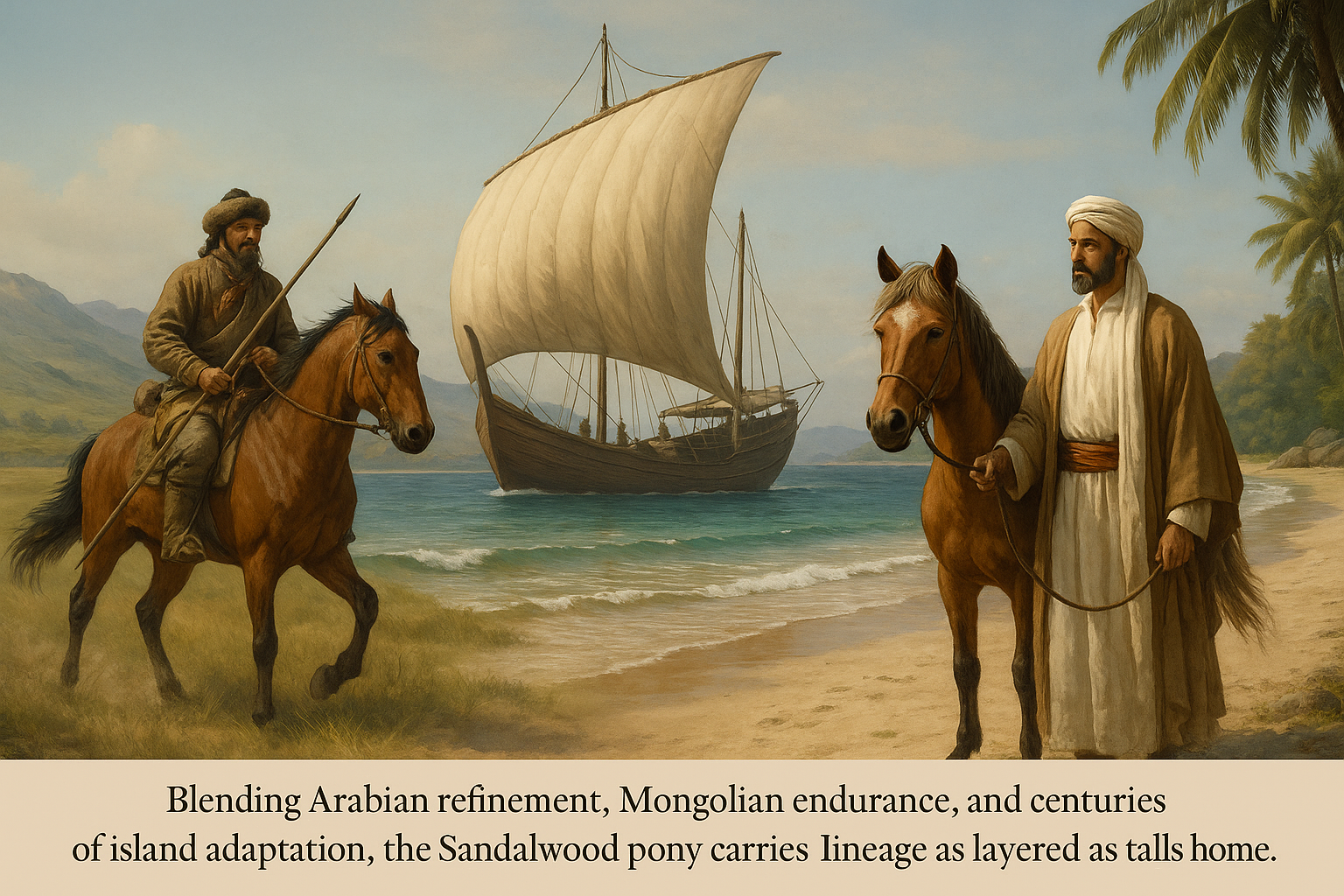 Despite its status as a native breed, the Sandalwood Pony is the result of historical exchange. Its ancestry blends ancient Mongolian and Arab bloodlines, brought by sea traders over centuries and gradually shaped by the harsh, dry environment of eastern Indonesia.